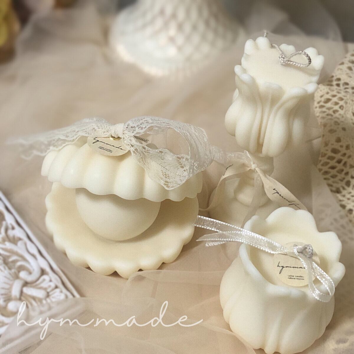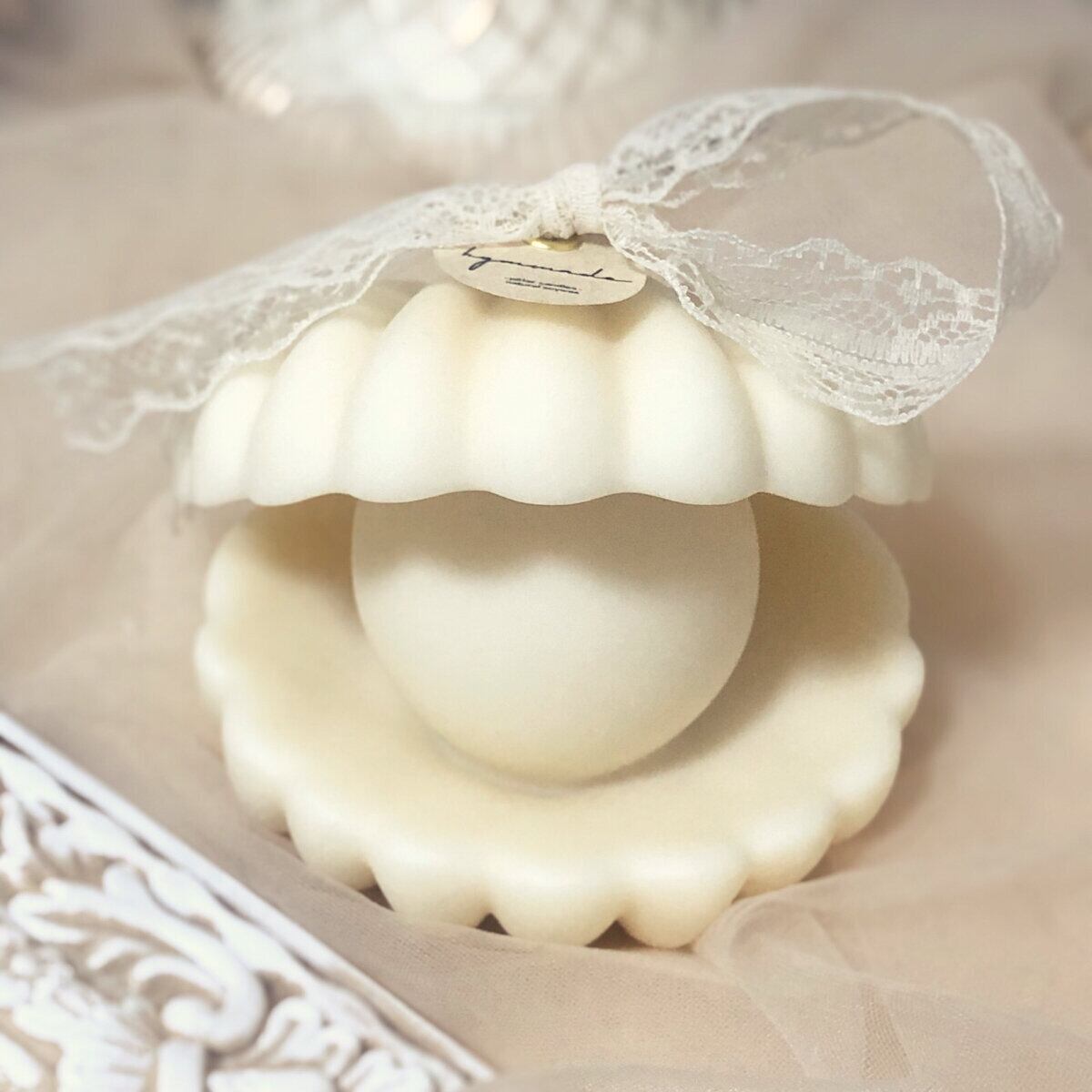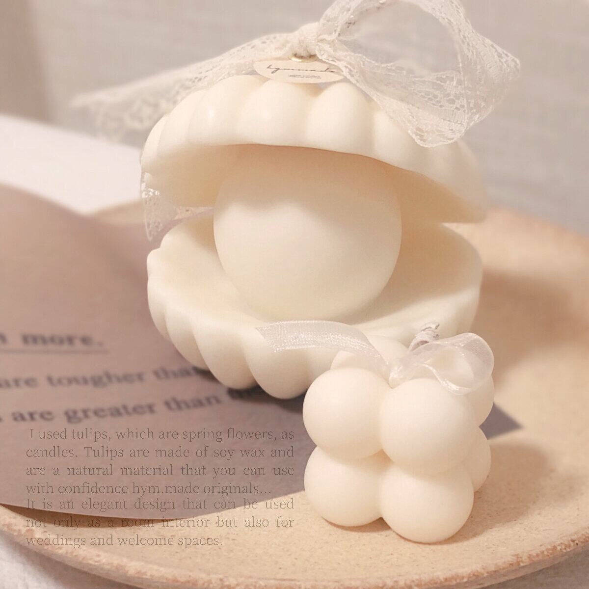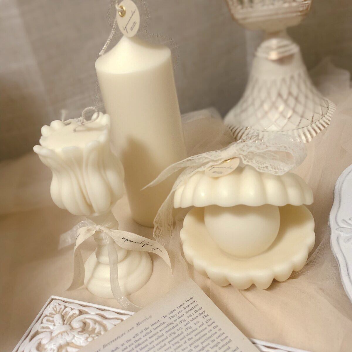 エレガントな真珠(パール)のキャンドルはお部屋の飾りとしてはもちろん、結婚式のウェルカムスペースにぴったり♪