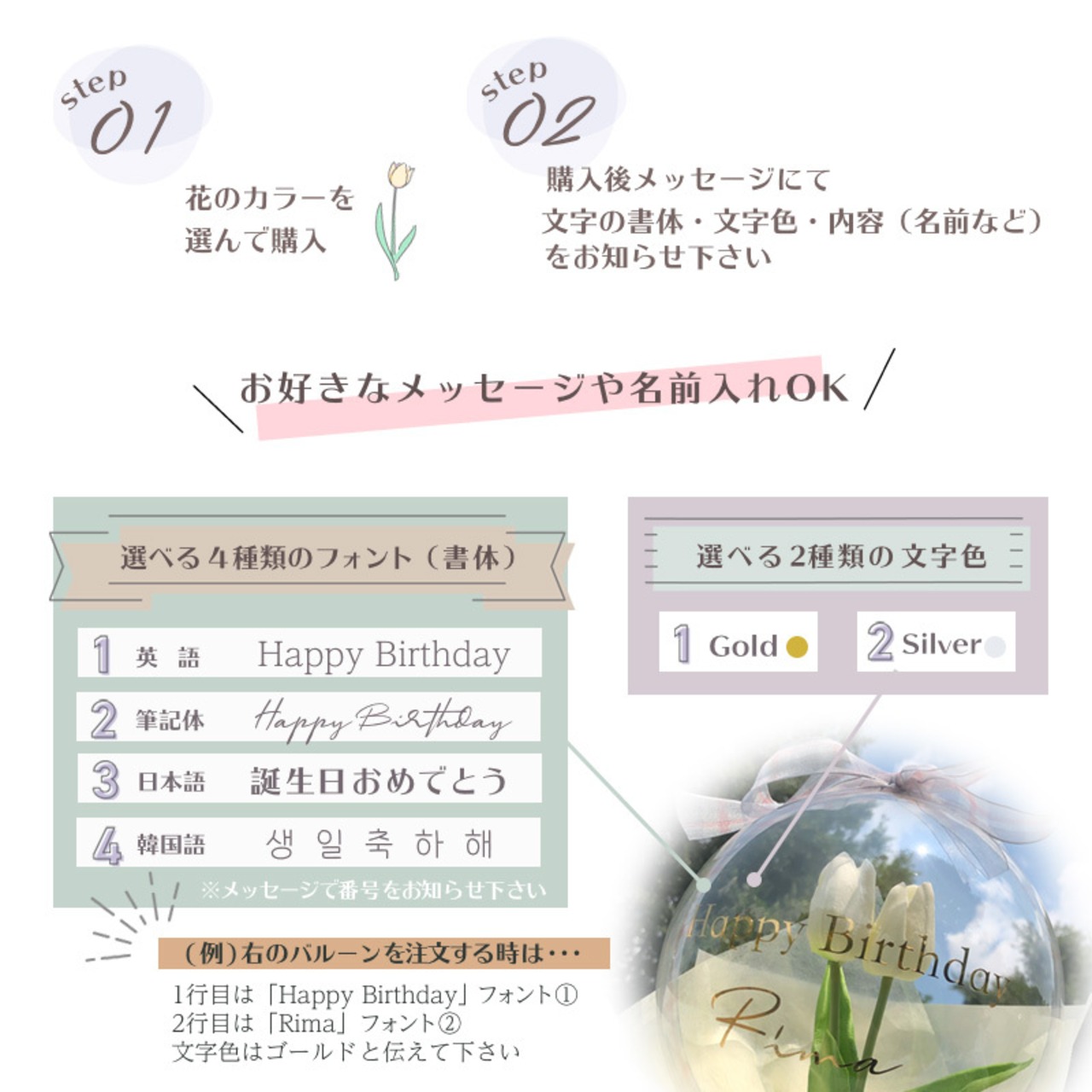 文字のカラー、文字のフォント(書体)、ご希望のメッセージや名前をメッセージでご連絡下さい。