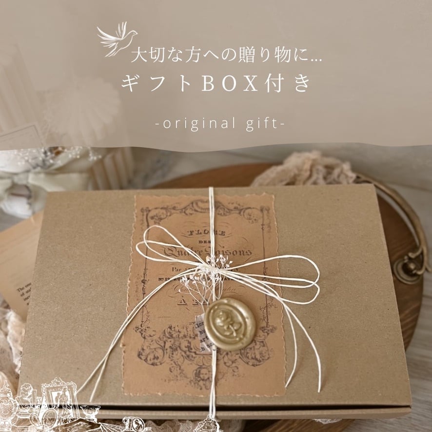 リボンはシルクを使用し、ラッピングはドライフラワーの霞草と、フランスで購入したシーリングスタンプを使用し、アンティーク調に仕上げました。
